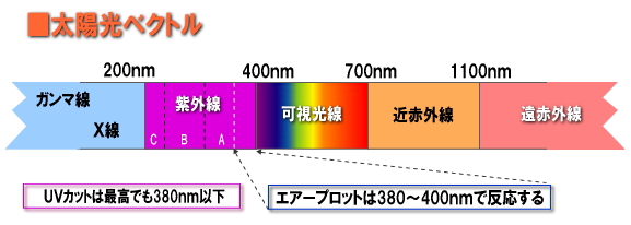 一般に出回っているUVカットガラスやフィルムは、一般的に波長が350nm以下に付いてカットしますし、紫外線99%カットとしているところでも380nm以下のカットですので、UV加工している窓ガラスや車のガラスでも、エアープロットは問題なく効果を発揮します。 |