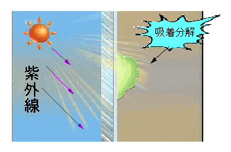 光触媒とは…「光(紫外線)が当たると触媒機能を発揮する物質」です。 当社の『エアープロット』ではこの光触媒を窓ガラスの内側に塗布し、さまざまな効果を発揮させます。 また当社独自の技術により、酸化チタン(TiO2)+白金(Pt)でより高い効果を出す事が出来ました。 |